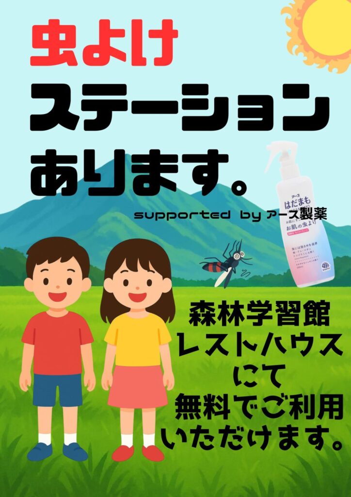 神山森林公園内にあります、森林学習館・レストハウスこもれびにて、無料の虫よけスプレーをご用意しております。