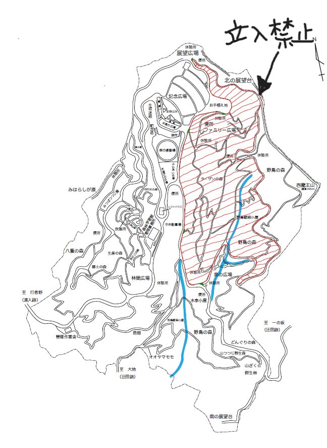 立入禁止区域に関しましては、下に掲載しております園内画像の赤く囲ってある地域になり、立入禁止区域への入り口も通行止めとなります。また立入禁止区域内のトイレに関しても使用中止になります。皆様ご確認の上、立ち入らないようにお願い申し上げます。
